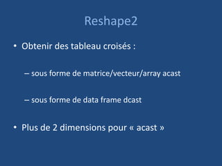 Le document présente une introduction à la bibliothèque R 'reshape2', utilisée pour obtenir des tableaux croisés sous diverses formes à l'aide des fonctions 'acast' et 'dcast'. Il explique comment transformer des données en spécifiant les lignes, colonnes et variables, avec des exemples pratiques d'application sur un ensemble de données concernant des jeux Lego. Les fonctions permettent d'agréger les données par différentes méthodes, telles que la somme ou la moyenne.