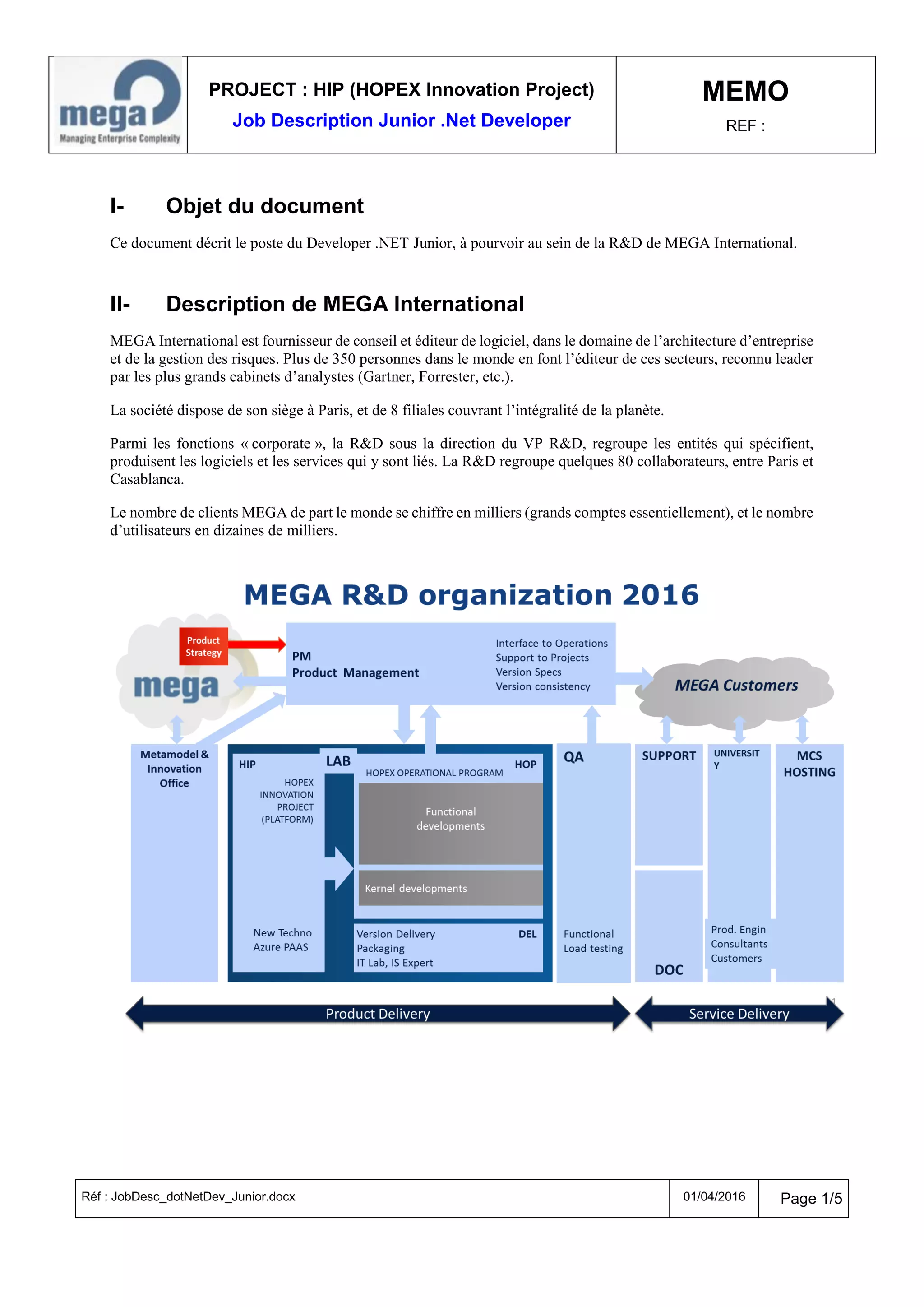 Le document décrit le poste de développeur .NET junior chez Mega International, une entreprise spécialisée dans l'architecture d'entreprise et la gestion des risques. Le développeur travaillera au sein d'une équipe R&D pour concevoir et réaliser des composants de la nouvelle plateforme, tout en participant à divers projets et en garantissant la qualité du développement. Les compétences requises incluent la maîtrise de C#/.NET, le développement web, ainsi qu'une bonne connaissance de l'anglais, tandis qu'une expérience dans le développement cloud serait un atout.