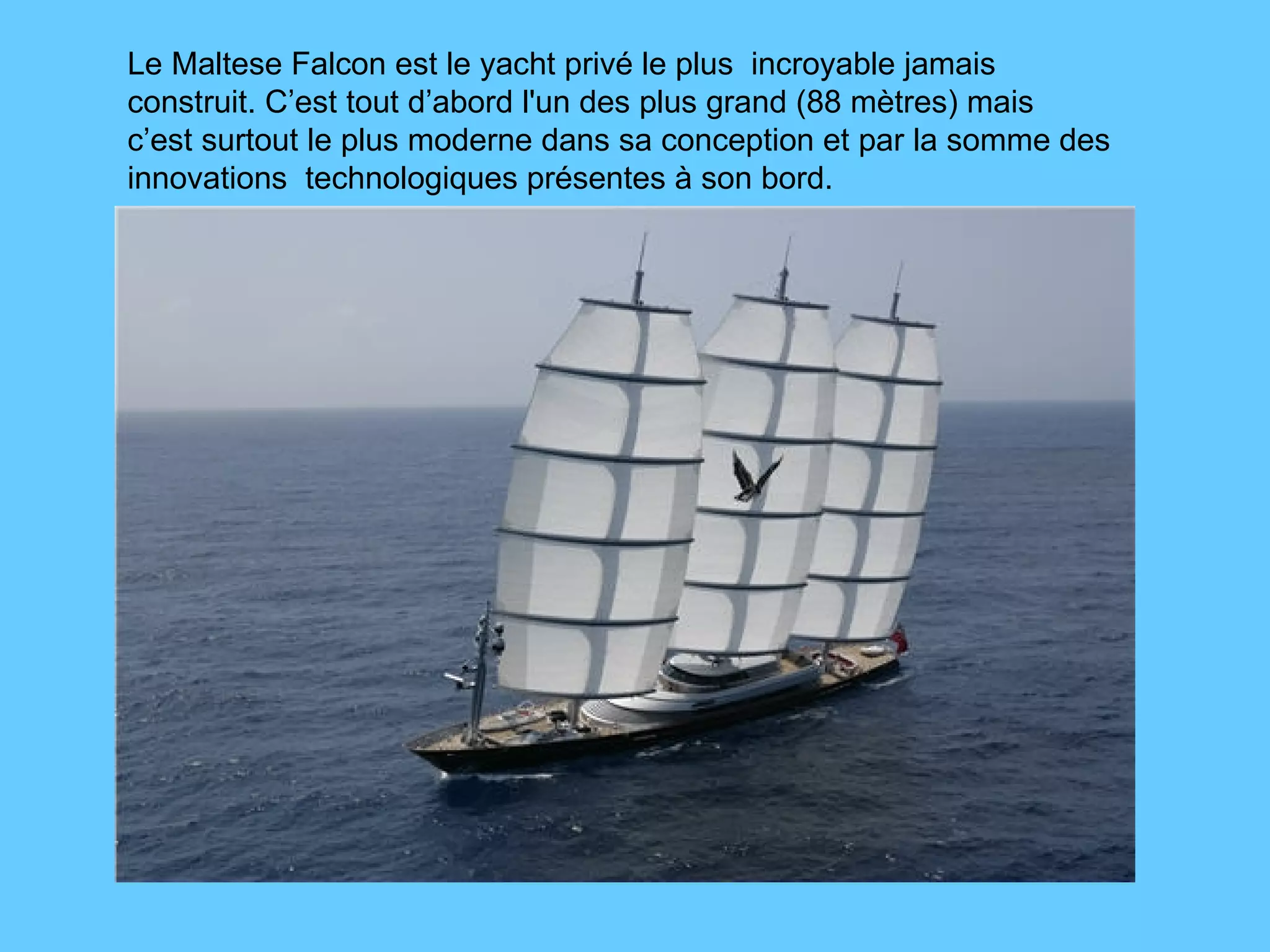 Le Maltese Falcon est un yacht privé de 88 mètres, alliant taille impressionnante et innovations technologiques. Doté d'un système de navigation avancé et de trois mâts rotatifs en carbone, il offre des performances inégalées et un confort luxueux dans un design contemporain. Estimé à environ 100 millions de dollars, ce voilier révolutionnaire se distingue par son espace de vie somptueux et sa capacité à être manœuvré par une seule personne.