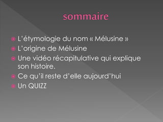 Mélusine est une fée légendaire issue de la mythologie romaine, souvent associée à des régions comme le Poitou et l'Alsace. Son nom, qui signifie « merveille » ou « brouillard de mer » en allemand, reflète son image magique, et elle continue d'influencer la culture moderne, notamment à travers des marques comme Starbucks. Le document présente également une vidéo récapitulative et un quiz sur l'histoire de Mélusine.