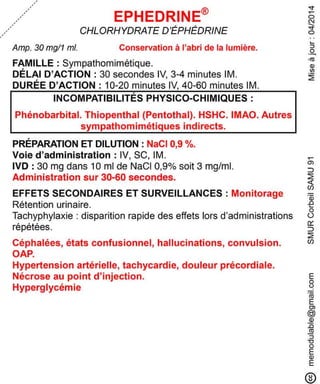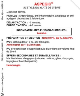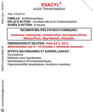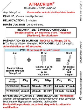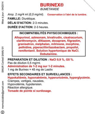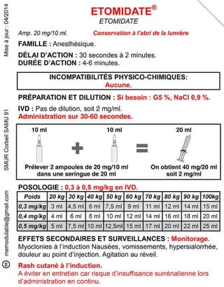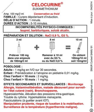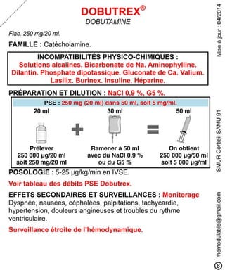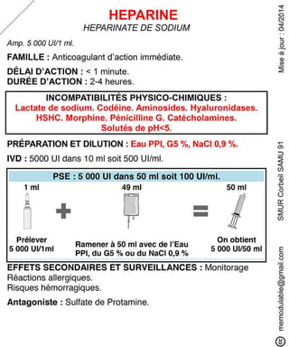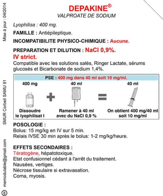 Le document présente des informations sur plusieurs médicaments d'urgence, y compris leur composition, leur dosage, leurs effets secondaires, et les précautions d'utilisation. Des médicaments tels que l'insuline, l'épinéphrine, le flumazénil et le midazolam sont abordés, avec des précisions sur leurs voies d'administration et les surveillances nécessaires. Les interactions et incompatibilités médicamenteuses sont également mentionnées pour chaque produit.