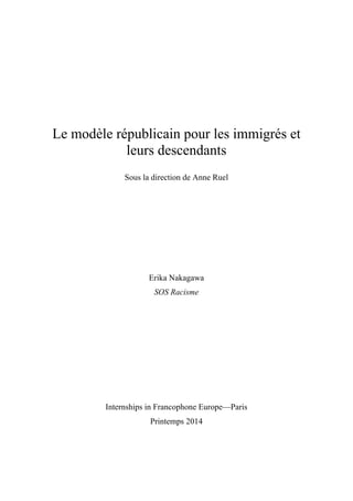 Ce document traite de l'intégration des immigrés en France et des défis auxquels ils sont confrontés, notamment le racisme et la discrimination. Il explique le modèle républicain français qui requiert l'adoption de ses valeurs tout en permettant aux immigrés de conserver leur culture d'origine. Le mémoire aborde également les obstacles rencontrés par les descendants des immigrés dans leur insertion sociale et professionnelle.
