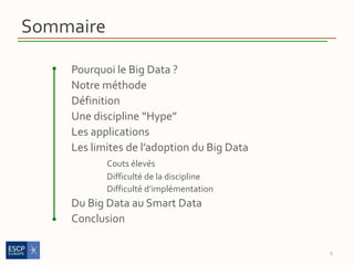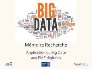 Le document explore l'application du big data aux PME digitales, soulignant son importance croissante mais aussi les défis d'adoption tels que les coûts élevés et la complexité d'implémentation. Il présente aussi des solutions pour faciliter cette adoption avec des formations adaptées et l'utilisation de technologies open source. Enfin, il met en avant le potentiel des PME à exploiter efficacement les données à condition de surmonter ces obstacles.