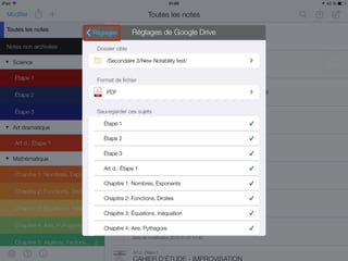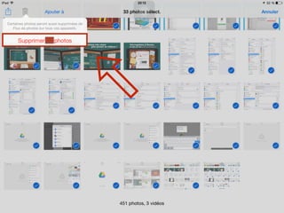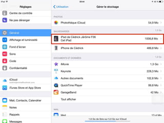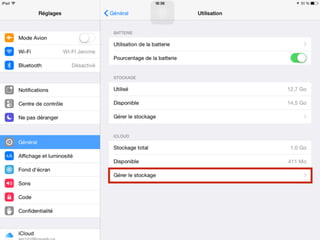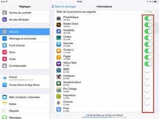 Le document décrit des étapes pour nettoyer un iPad, divisées en plusieurs parties incluant la gestion des photos, les réglages d'iCloud, et l'utilisation de Notability. Il aborde également le ménage des applications et des documents inutiles, comme ceux de Notability, Pages, et des sauvegardes de jeux. Le temps estimé pour chaque tâche varie entre 5 et 10 minutes.