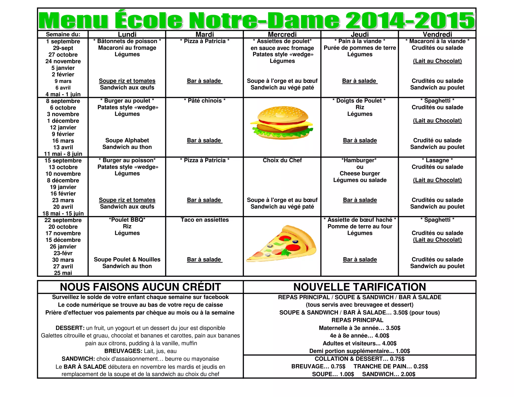 Le document présente un menu hebdomadaire scolaire détaillant les repas servis de septembre à juin, y compris des options de repas principal, de soupes et de salades. Il indique également les prix pour les différents niveaux scolaires et les modalités de paiement. En outre, il mentionne l'introduction d'un bar à salade et les détails des collations et desserts disponibles.