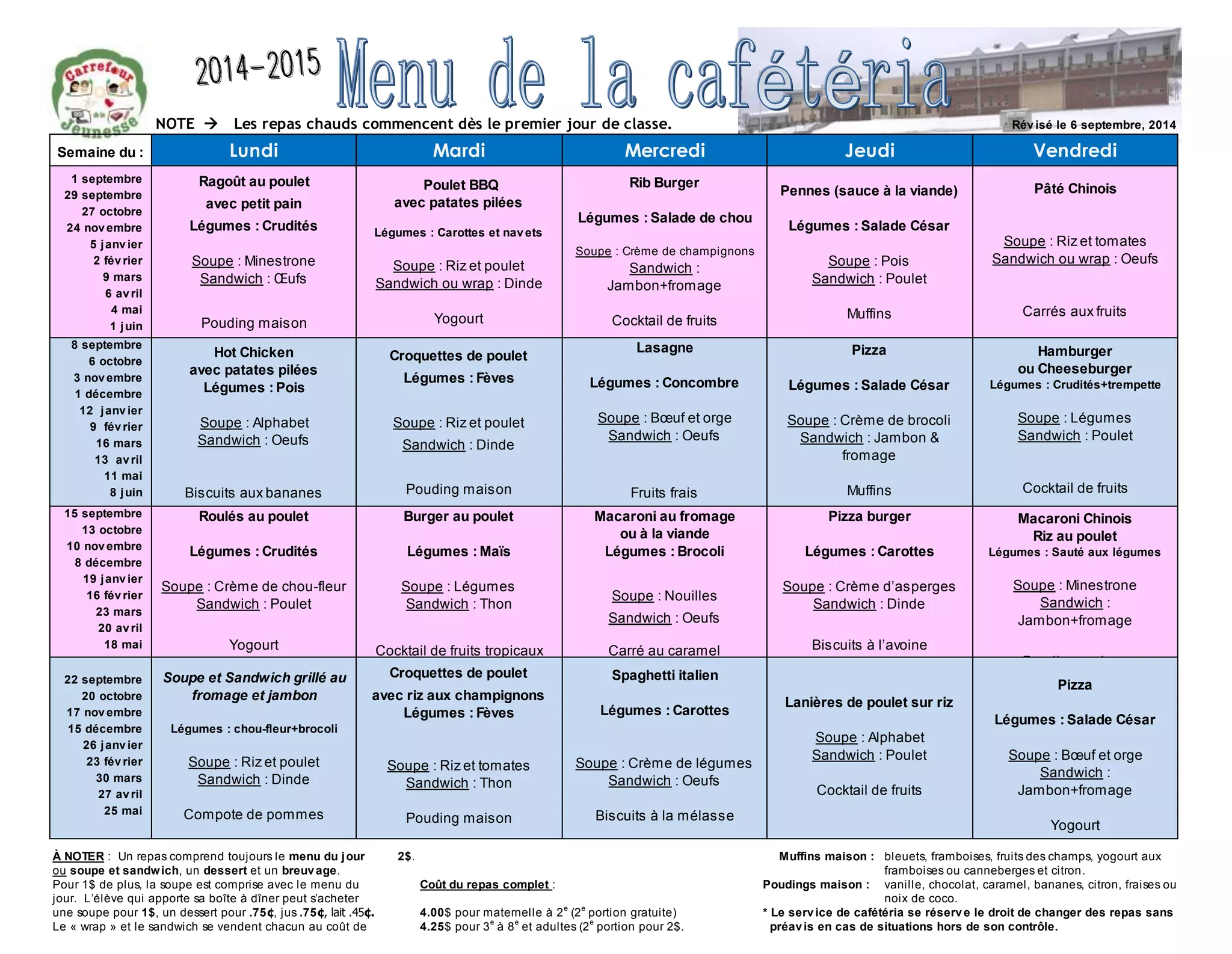 Le document fournit un menu de repas chauds pour les élèves, incluant des plats variés et des options de sandwichs pour chaque jour de la semaine, ainsi que les légumes et soupes associés. Les coûts des repas et des ajouts comme la soupe et le dessert sont précisés. Il est également noté que des changements de repas peuvent survenir sans préavis.