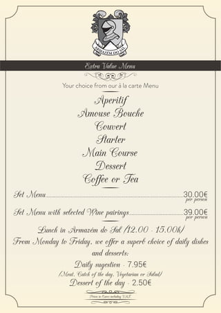 Le document présente les prix d'un menu spécial dans un restaurant, en indiquant qu'ils sont en euros et incluent la TVA. Un menu à la carte et plusieurs options de déjeuner sont également offerts, avec des prix variant de 7,95 € à 39,00 € selon la sélection. Les horaires du déjeuner sont de 12h00 à 15h00, du lundi au vendredi.