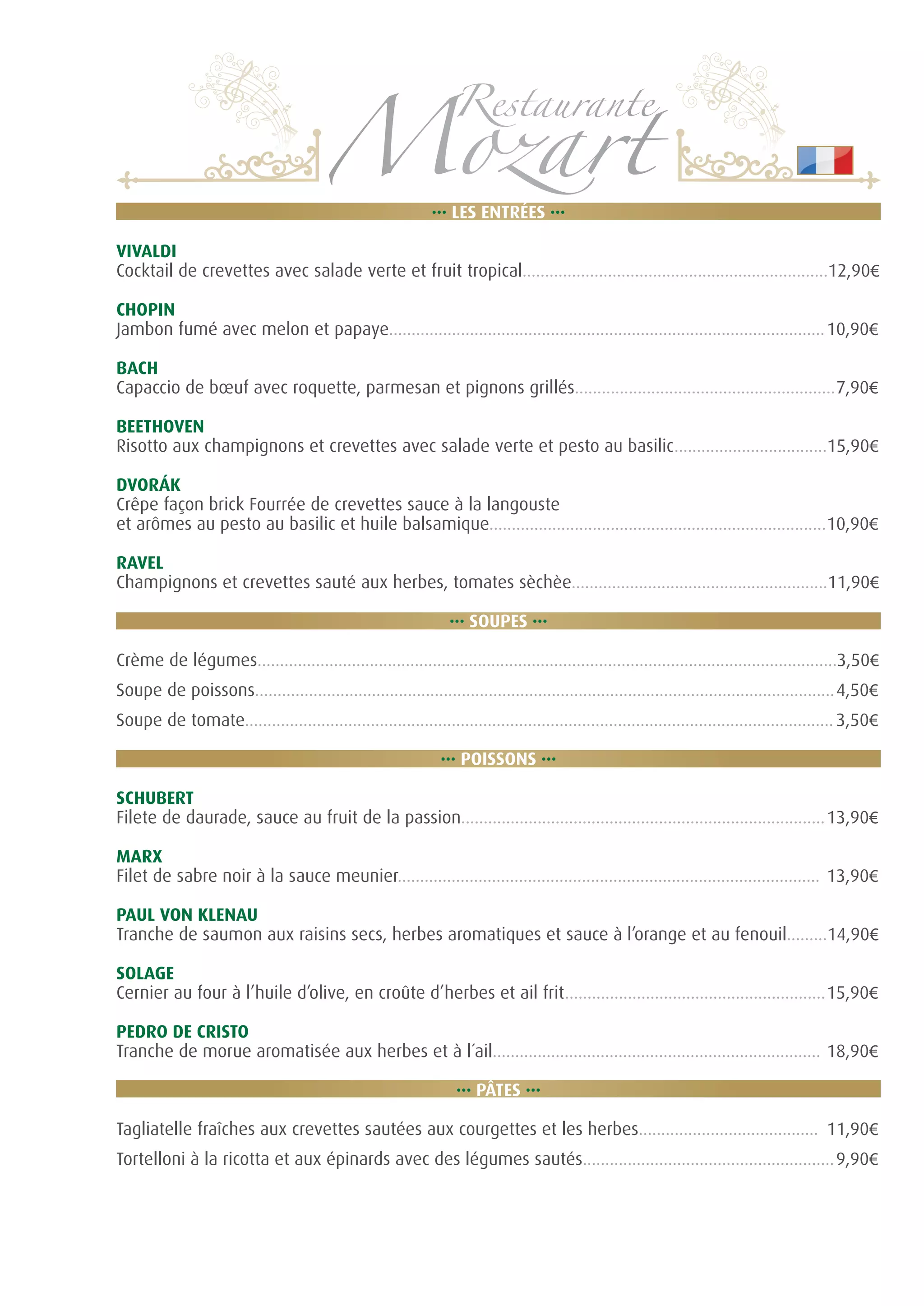 Le document présente un menu varié comprenant des entrées, des soupes, des plats de résistance et des desserts, avec des exemples tels que des cocktails de crevettes, des risottos et des magrets de canard. Chaque plat est associé à son prix en euros. Des spécialités italiennes et des suggestions de fruits complètent l'offre.