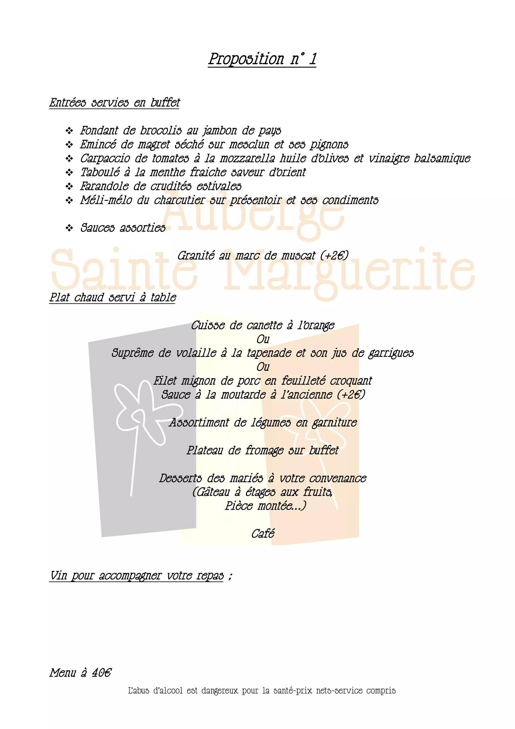 Le document présente plusieurs propositions de menus pour un événement, comprenant des entrées, plats chauds et desserts, avec des options de prix allant de 40€ à 53€. Chaque proposition inclut des spécialités variées, des suggestions de vins et des options supplémentaires pour agrémenter la soirée. Des menus pour enfants et des informations sur les droits de bouchon pour les boissons apportées par le client sont également mentionnées.