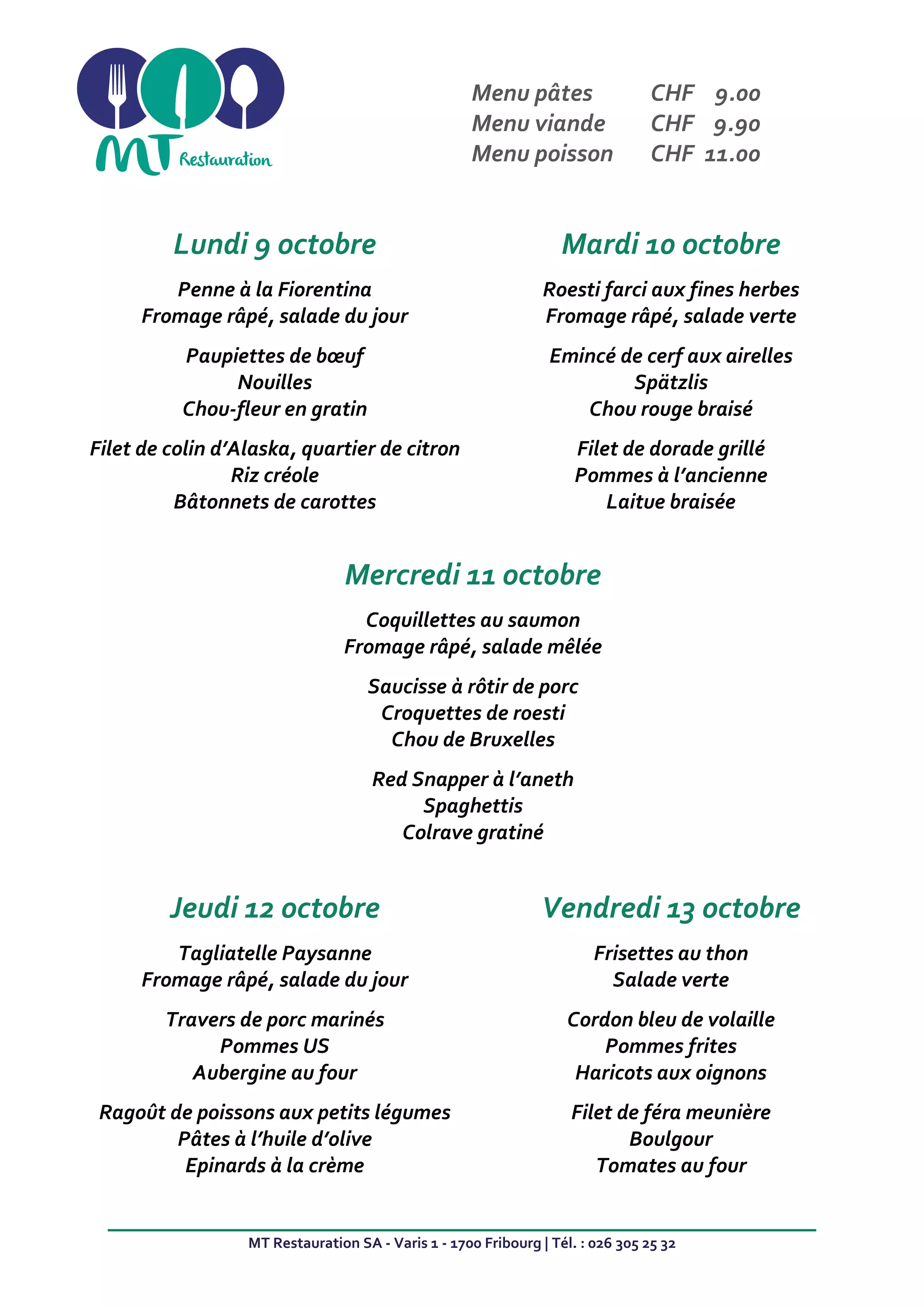 Le document présente les menus hebdomadaires d'un restaurant à Fribourg, avec des options de plats de pâtes, de viande et de poisson. Il détaille les plats proposés chaque jour du 9 au 13 octobre, incluant des ingrédients et des méthodes de préparation. Les prix des différents menus sont également mentionnés, variant de 9,00 à 11,00 CHF.
