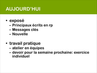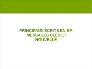 Le document traite des principaux écrits en relations publiques, soulignant l'importance de la cohérence des messages tant à l'interne qu'à l'externe pour maintenir la crédibilité de l'organisation. Il aborde également les particularités de la rédaction sous des délais restreints et l'importance d'utiliser des faits concrets tout en communiquant des messages clés adaptés aux besoins du public. Enfin, le texte fournit des conseils sur la rédaction d'articles, de communiqués et de nouvelles en mettant en avant l'objectivité et des structures claires.