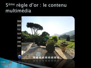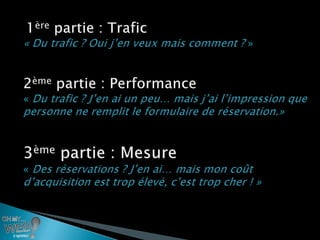 Le document souligne l'importance pour les acteurs du tourisme d'optimiser leur visibilité en ligne via des stratégies d'e-marketing, notamment en améliorant la structure de leur site internet et leur e-réputation. Il décrit les bonnes pratiques de conception web, telles que la rapidité, l'accessibilité et la clarté, ainsi que l'importance de contenus engageants et pertinents pour séduire les internautes. Enfin, il évoque la nécessité de mesurer la performance du site à travers des indicateurs de trafic et d'engagement pour ajuster les stratégies marketing.