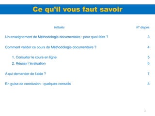 L'enseignement de méthodologie documentaire en L3, destiné aux étudiants de chimie du pôle Guadeloupe, vise à approfondir leurs compétences en recherche d'information à la bibliothèque universitaire et sur Internet. Pour valider ce cours, les étudiants doivent consulter un cours en ligne et réussir deux examens. Une aide pédagogique est disponible à la fois en présentiel et à distance pour soutenir leur apprentissage.