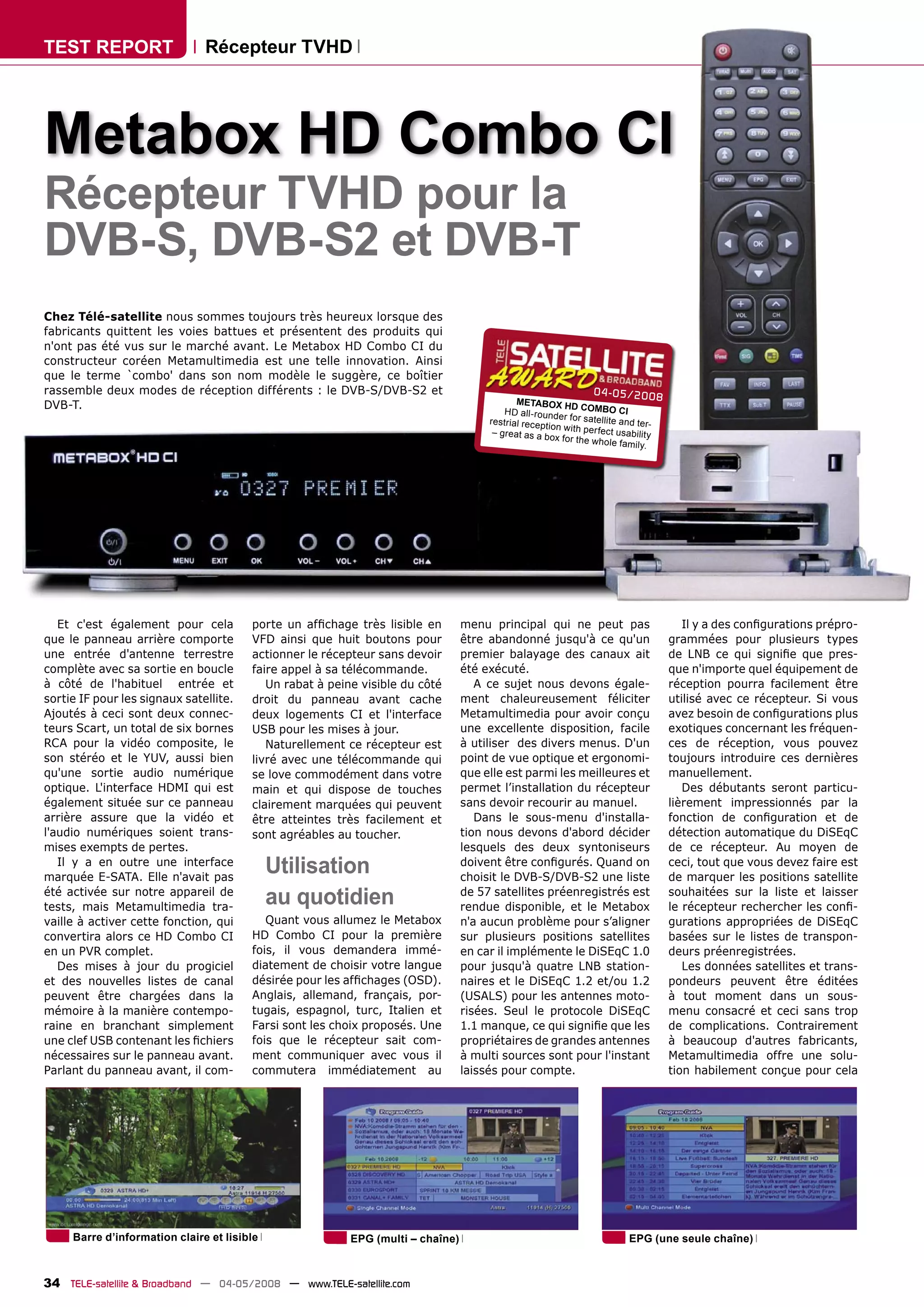 Le Metabox HD Combo CI est un récepteur TV innovant capable de recevoir des signaux DVB-S, DVB-S2, et DVB-T, offrant ainsi une polyvalence pour regarder des chaînes terrestres et satellites. Il est facile à utiliser grâce à une interface conviviale, un panneau arrière pratique, et des fonctionnalités avancées telles que la détection automatique des canaux. Ce récepteur est particulièrement apprécié pour sa conception ergonomique et sa capacité à gérer jusqu'à 10 000 chaînes avec une mémoire de programme bien organisée.