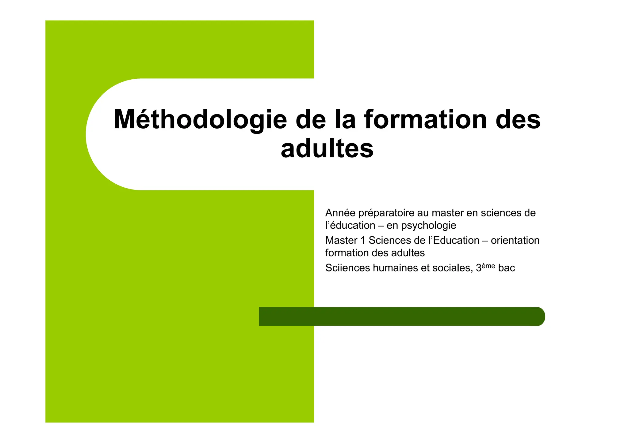 Le document aborde la formation des adultes dans le cadre d'un master en sciences de l'éducation, avec un focus sur les méthodologies adaptées à ce public. Il décrit les compétences et le rôle des formateurs, ainsi que les spécificités pédagogiques requises pour répondre aux besoins des adultes en formation. En outre, il met en lumière les disparités entre l'enseignement traditionnel et la formation d'adultes, soulignant l'importance d'une approche individualisée et réflexive.