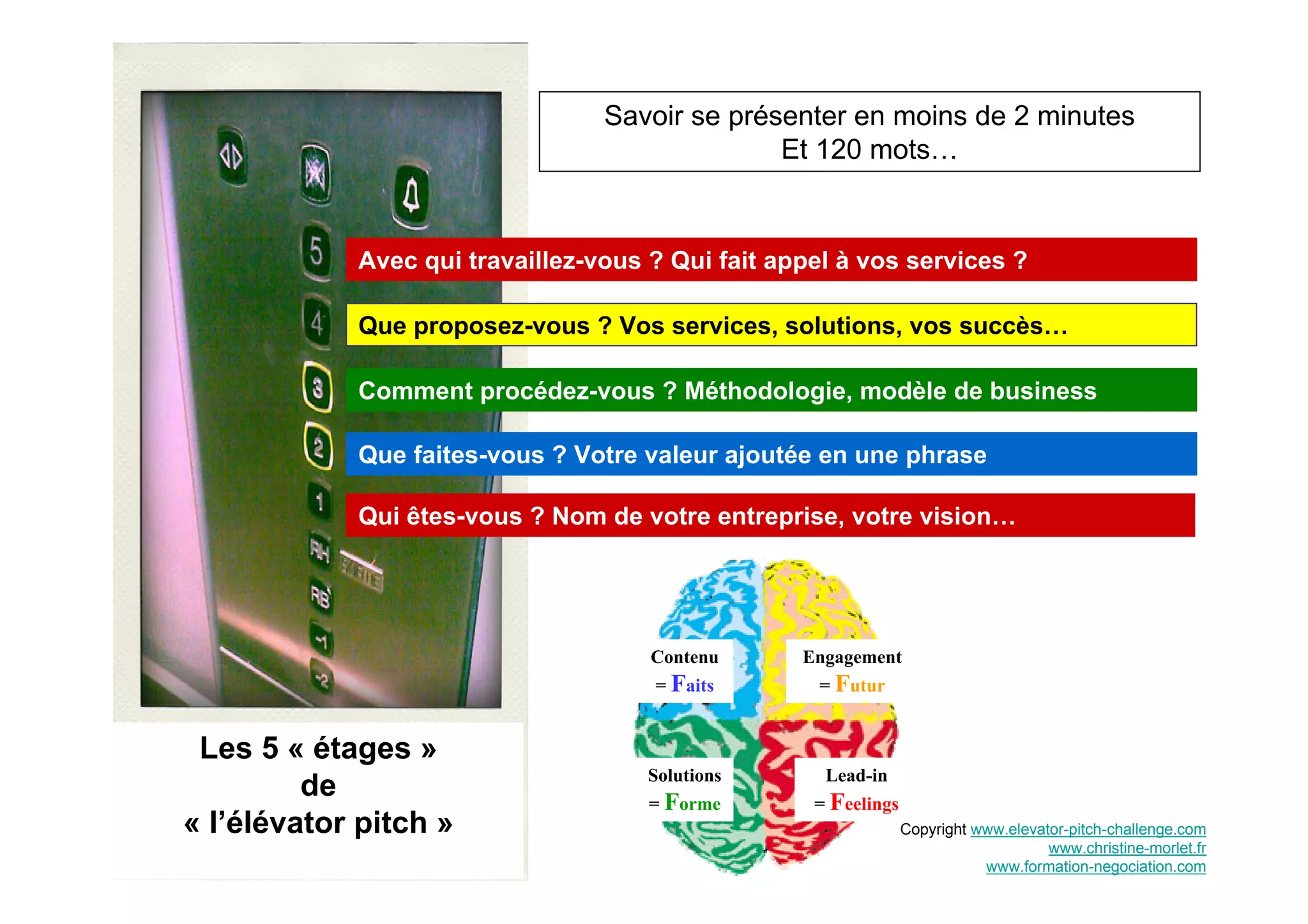 Le document propose des conseils sur la façon de se présenter efficacement en moins de 2 minutes et 120 mots. Il souligne l'importance de définir son objectif, son message clé, son public cible, et de se différencier des concurrents. Des questions clés sont également fournies pour aider à préparer un pitch convaincant.