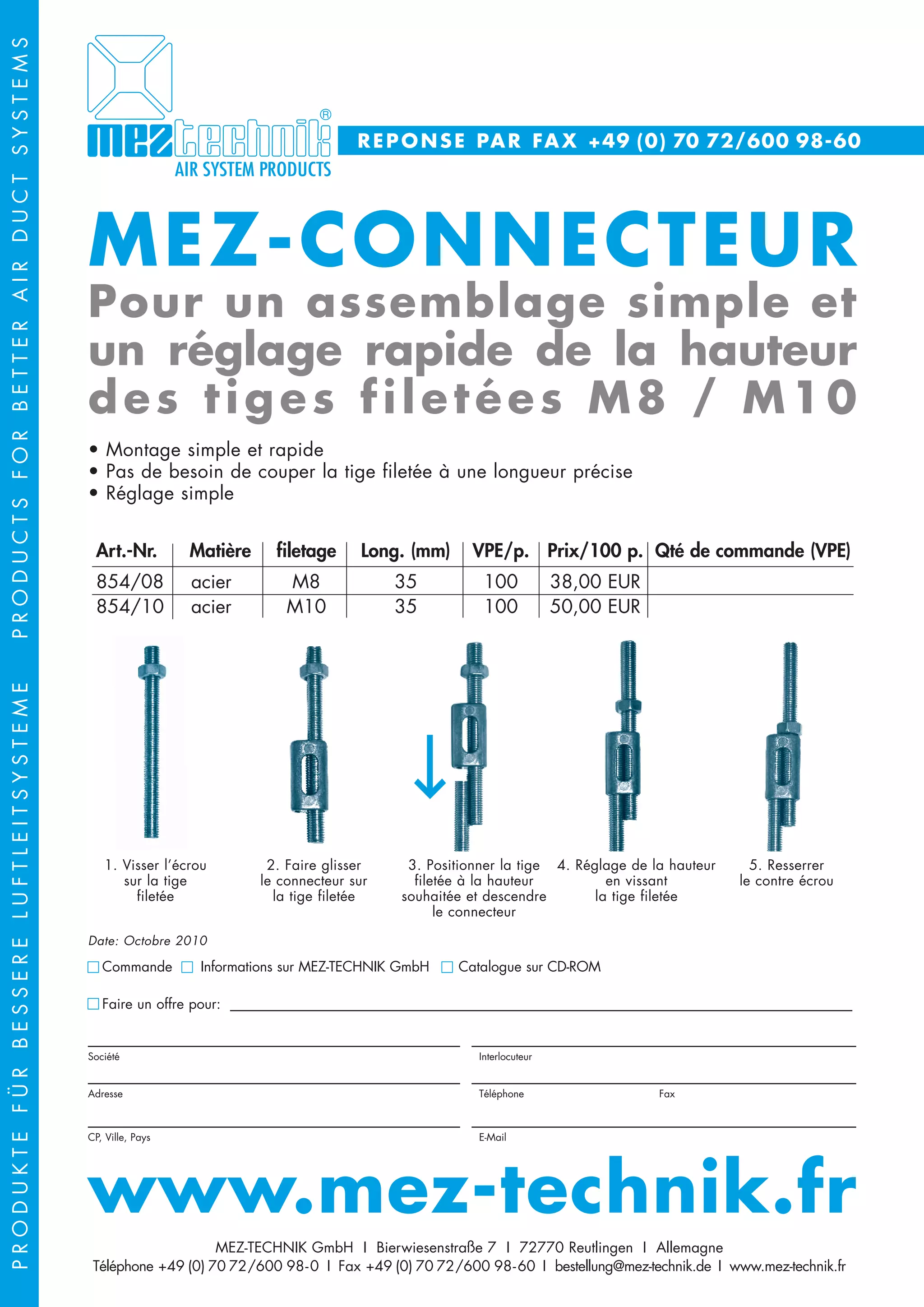 Le document décrit un connecteur MEZ pour le montage et le réglage rapide des tiges filetées M8 et M10 dans les systèmes de conduits d'air. Il fournit des informations sur le montage, la hauteur réglable et les prix, ainsi que les détails de contact de l'entreprise MEZ-Technik GmbH. Des instructions pour passer commande et les spécifications des produits sont également incluses.