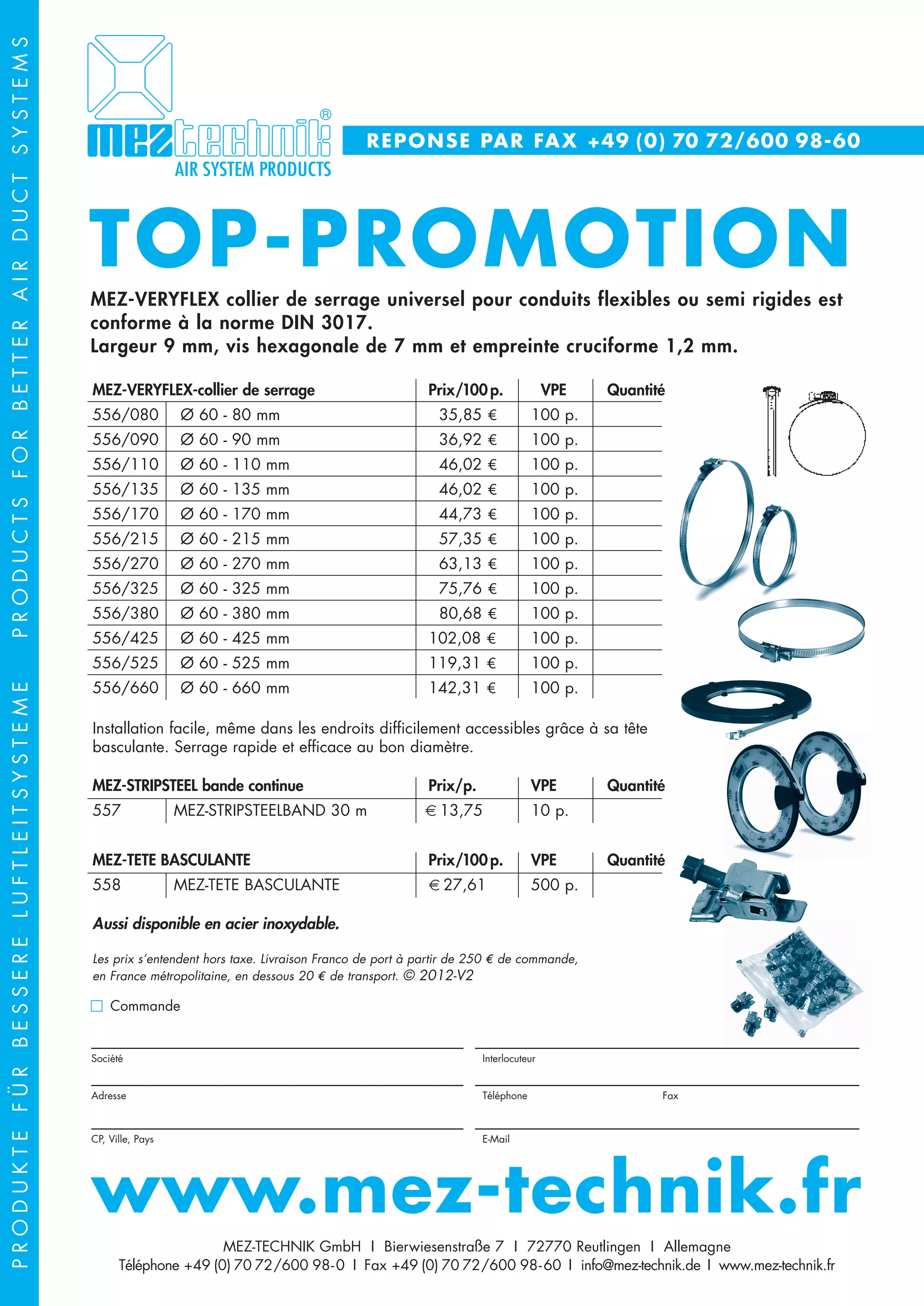Le document présente une gamme de produits pour systèmes de conduits d'air, notamment le collier de serrage universel mez-veryflex conforme à la norme DIN 3017. Différentes tailles et prix sont spécifiés, ainsi que des informations sur la facilité d'installation et les prix hors taxe. Des options supplémentaires en acier inoxydable sont également mentionnées, avec des conditions de livraison.