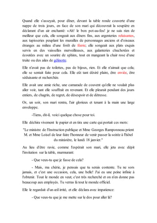 L'extrait de 'La Parure' de Guy de Maupassant présente Mathilde Loisel, une femme d'origine modeste, qui aspire à une vie de luxe et de beauté qu'elle ne peut pas atteindre. Son mari, malgré leurs moyens limités, lui offre une somme d'argent pour acheter une robe afin qu'elle puisse assister à une soirée prestigieuse, exacerbant ainsi son désir d'appartenir à une classe sociale supérieure. Cet extrait illustre la souffrance de Mathilde face à sa réalité et ses rêves inaccessibles.