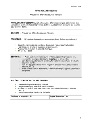 Le document traite de l'analyse des différents niveaux d'énergie dans un cadre de maintenance industrielle, en se concentrant sur la production, la distribution et la sécurité des énergies utilisées par le système ecolpap. Les étudiants doivent respecter des consignes de sécurité lors des manipulations et sont encouragés à examiner les systèmes électriques, pneumatiques et hydrauliques. Il comprend également des sections sur les types de centrales électriques et le fonctionnement des transformateurs ainsi que des équipements nécessaires pour la transformation et la distribution d'énergie.