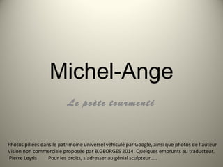 Le document explore la vie complexe et tourmentée de Michel-Ange, mettant l'accent sur son amour pour la beauté et ses luttes intérieures liées à la foi et au péché. Il aborde également ses relations platoniciennes, ses inspirations artistiques et la façon dont son œuvre, notamment ses poèmes, reflète son désir de transcender le monde matériel envers une beauté divine. Enfin, il souligne son rôle d'artiste comme un pont vers la spiritualité, tout en luttant avec ses propres démons personnels.