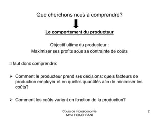Ce document présente un cours de microéconomie axé sur la théorie de la production et des coûts. Il vise à comprendre le comportement du producteur pour maximiser les profits en fonction des facteurs de production, incluant une distinction entre la courte et la longue période. La fonction de production, les rendements et les phases de la production sont également approfondis.
