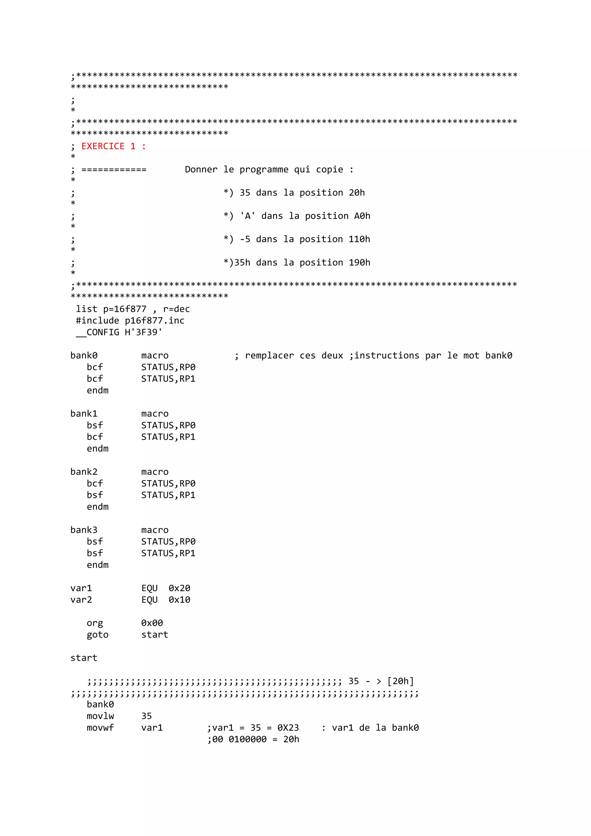 Le document fournit divers exercices en langage d'assemblage pour le microcontrôleur PIC16F877, illustrant des programmations variées telles que la manipulation de mémoire, la soustraction de constantes et le contrôle de LEDs. Chaque exercice est accompagné de son code source, décrivant des tâches spécifiques incluant la copie de valeurs, la comparaison de mémoire et l'implémentation de temporisations. Les sections du document utilisent des structures de contrôle et des microinstructions pour effectuer des opérations sur des adresses mémoire données.