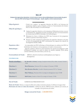 Ce document présente une étude sur les approches éducatives et la mise en œuvre des problématiques de genre au sein des IFEF de Korhogo et Ferkessédougou, avec pour objectifs l'analyse des programmes d'équité, d'égalité et d'autonomisation des femmes. La méthodologie est qualitative, combinant des entretiens, des focus groups et des observations, afin de mieux comprendre les forces et faiblesses des institutions dans ce contexte. Les résultats visent à renforcer les capacités des IFEF et à développer des interventions adaptées aux besoins des femmes et aux objectifs de développement durable.