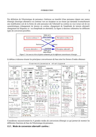 L'électronique de puissance concerne la conversion statique de l'énergie électrique d'une forme à une autre pour répondre à des besoins spécifiques, en utilisant divers composants électroniques. Elle permet des fonctions telles que la variation de vitesse des moteurs, résolvant des problèmes d'électrotechnique classique et apportant une flexibilité dans les systèmes d'alimentation. Les convertisseurs statiques et les interrupteurs semi-conducteurs jouent un rôle crucial dans le transfert et la régulation de l'énergie au sein de cette discipline.