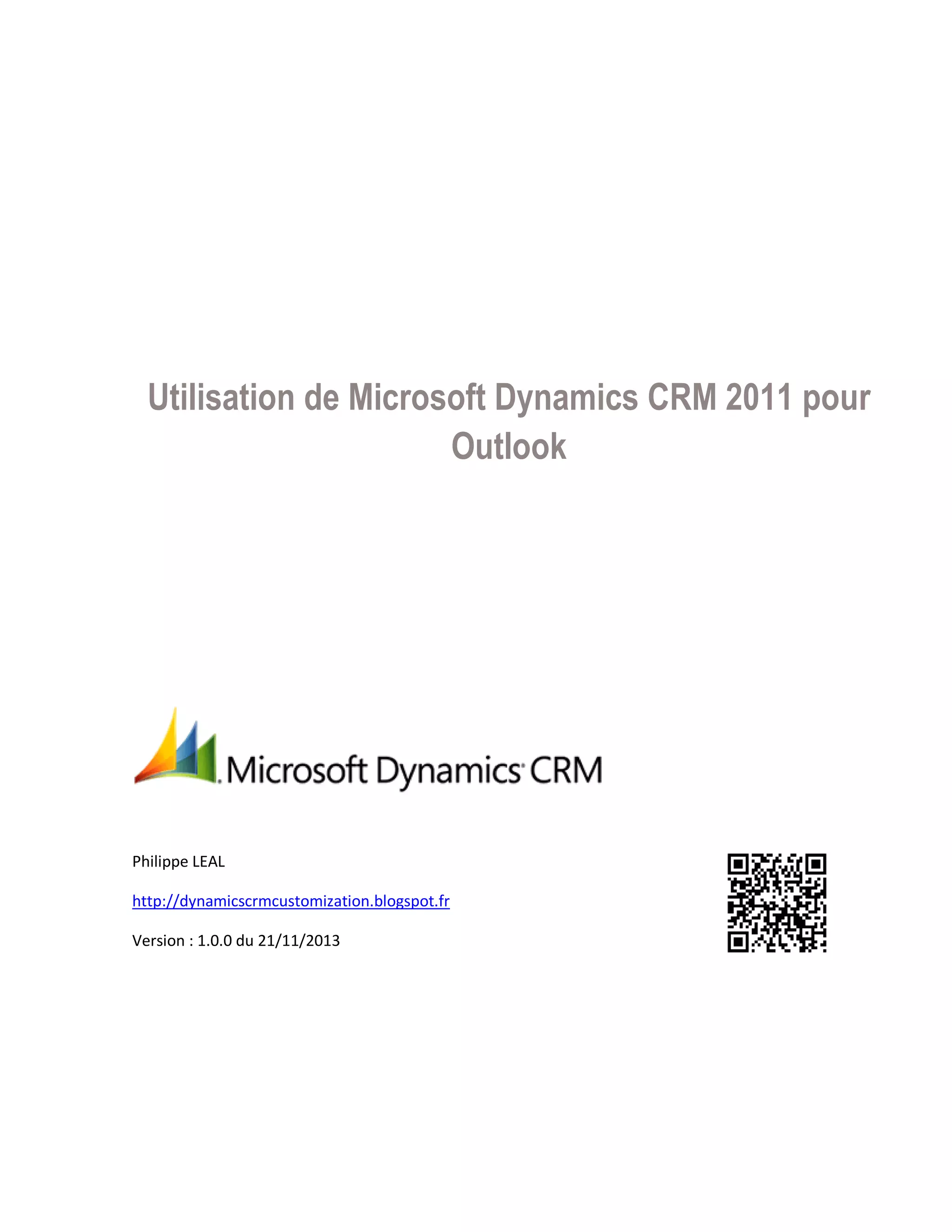 Ce document est un guide d'utilisation de Microsoft Dynamics CRM 2011 pour Outlook, qui inclut des instructions sur l'installation, la configuration et l'exécution de tâches. Il aborde des fonctionnalités telles que le suivi des courriels, la synchronisation des données et l'utilisation des enregistrements CRM dans Outlook. Le document fournit également des détails sur les options de carnet d'adresses et de mode hors connexion.