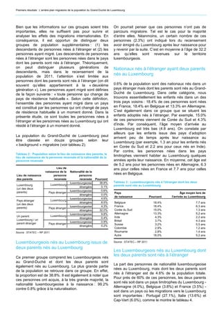 61.2% de la population du Grand-Duché de Luxembourg a un arrière-plan migratoire, avec 40.1% nés à l'étranger. Les nationalités les plus représentées parmi les étrangers incluent les Portugais, Français, Italiens et Belges. La population est diversifiée, avec des personnes naturalisées et des descendants d'immigrés constituant une part significative de la société luxembourgeoise.