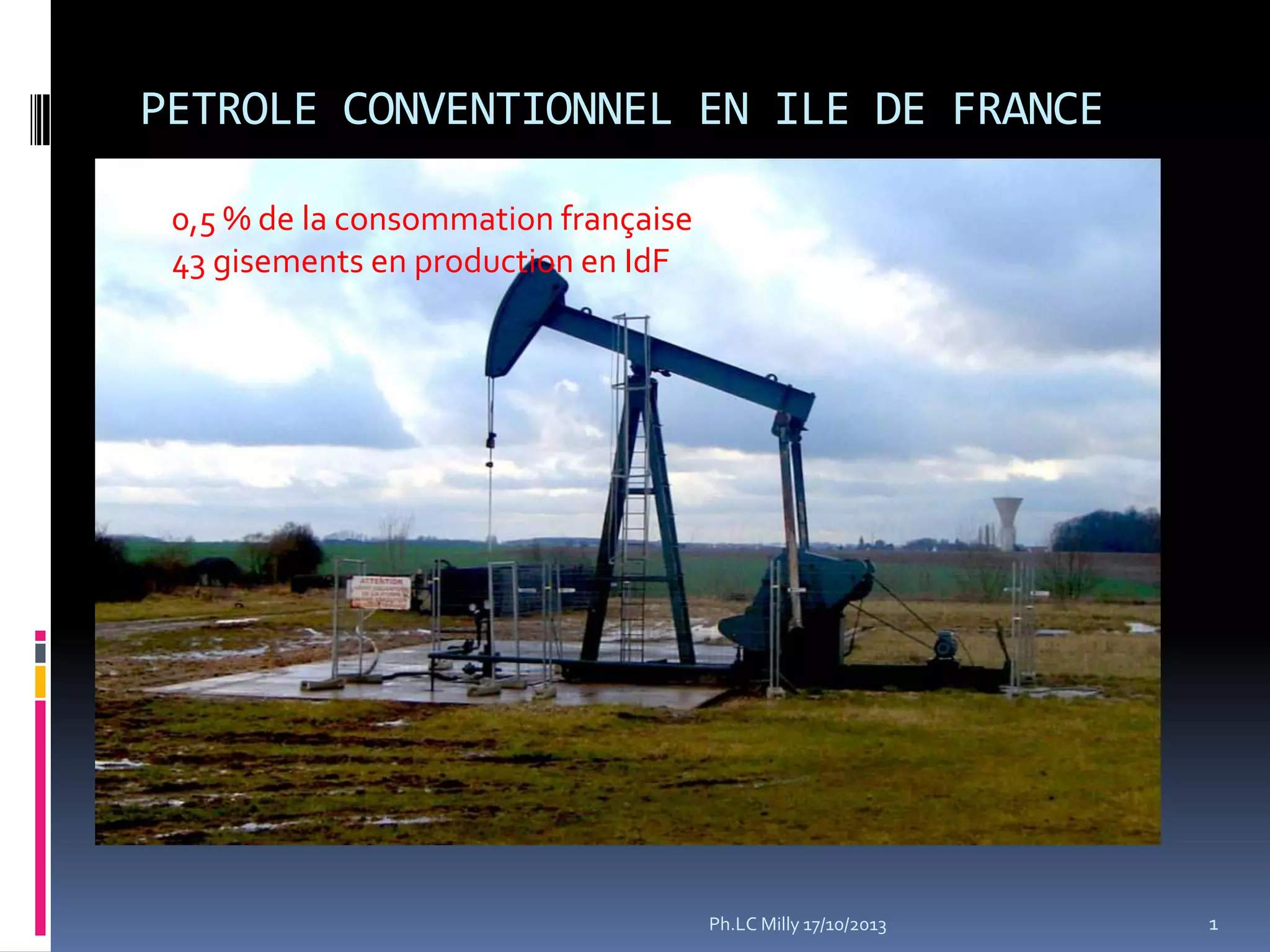 Le document traite de la production de pétrole conventionnel en Île-de-France, représentant seulement 0,5 % de la consommation française, avec des défis liés aux impacts environnementaux de l'extraction, notamment la pollution de l'eau et de l'air. Il souligne les risques sanitaires associés aux fluides injectés lors de la fracturation hydraulique et présente des exemples d'accidents industriels survenus aux États-Unis. En conclusion, il aborde la question de l'indépendance énergétique, tout en soulevant des préoccupations économiques et environnementales liées à l'exploitation pétrolière.
