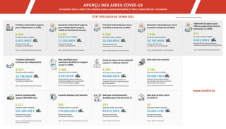 Le document présente un aperçu des aides covid-19 accordées aux entreprises et indépendants, incluant des montants totaux et des statistiques sur les demandes traitées. Il détaille également les mesures de chômage partiel en vigueur jusqu'au 30 juin 2021, ainsi que des informations sur les avances financières et les remboursements. Au total, une somme significative a été allouée pour soutenir les secteurs durement touchés par la crise sanitaire.