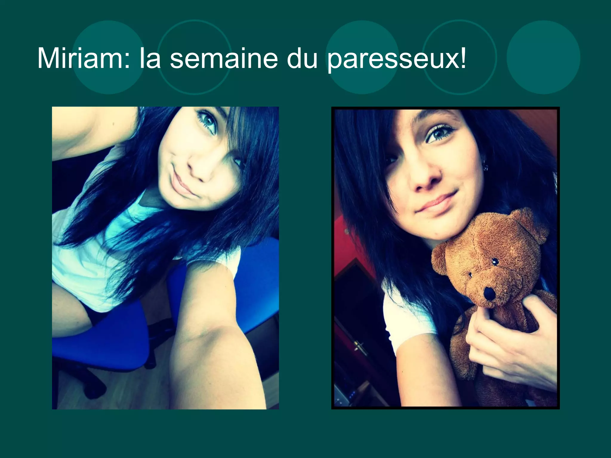 Miriam décrit sa semaine avec diverses activités. Elle regarde la télévision, danse, promène son chien, joue au basket, utilise l'ordinateur, va au cinéma et assiste à l'église. Chaque jour de la semaine est dédié à une activité spécifique.