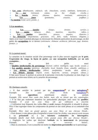 Le document fournit des directives sur la rédaction de portraits physiques et moraux de personnages, en insistant sur l'importance des détails descriptifs tels que l'apparence physique et les traits de caractère. Il recommande également d'utiliser des comparaisons, des métaphores et des expressions vivantes pour enrichir la description tout en évitant la répétition de verbes communs. Finalement, il encourage à inclure des impressions personnelles sur le personnage dans la conclusion.