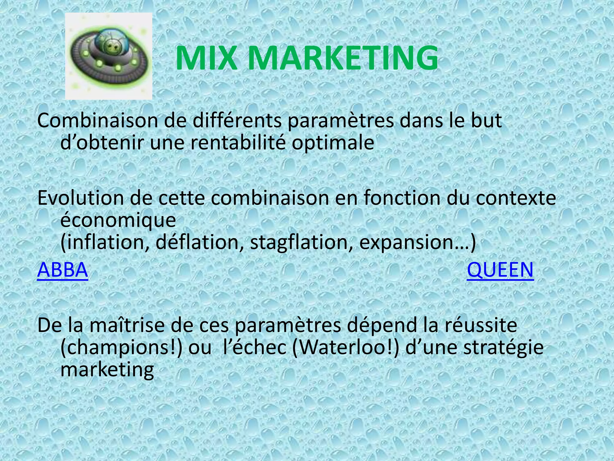 Le mix marketing est une combinaison de paramètres qui vise à optimiser la rentabilité, variant selon le contexte économique et le secteur d’activité. Différents modèles tels que le mix 4P et 4C mettent l'accent sur des aspects comme le produit, le prix, la communication et la distribution, chacun ayant des détails spécifiques à considérer. La maîtrise de ces éléments est cruciale pour le succès ou l'échec d'une stratégie marketing.