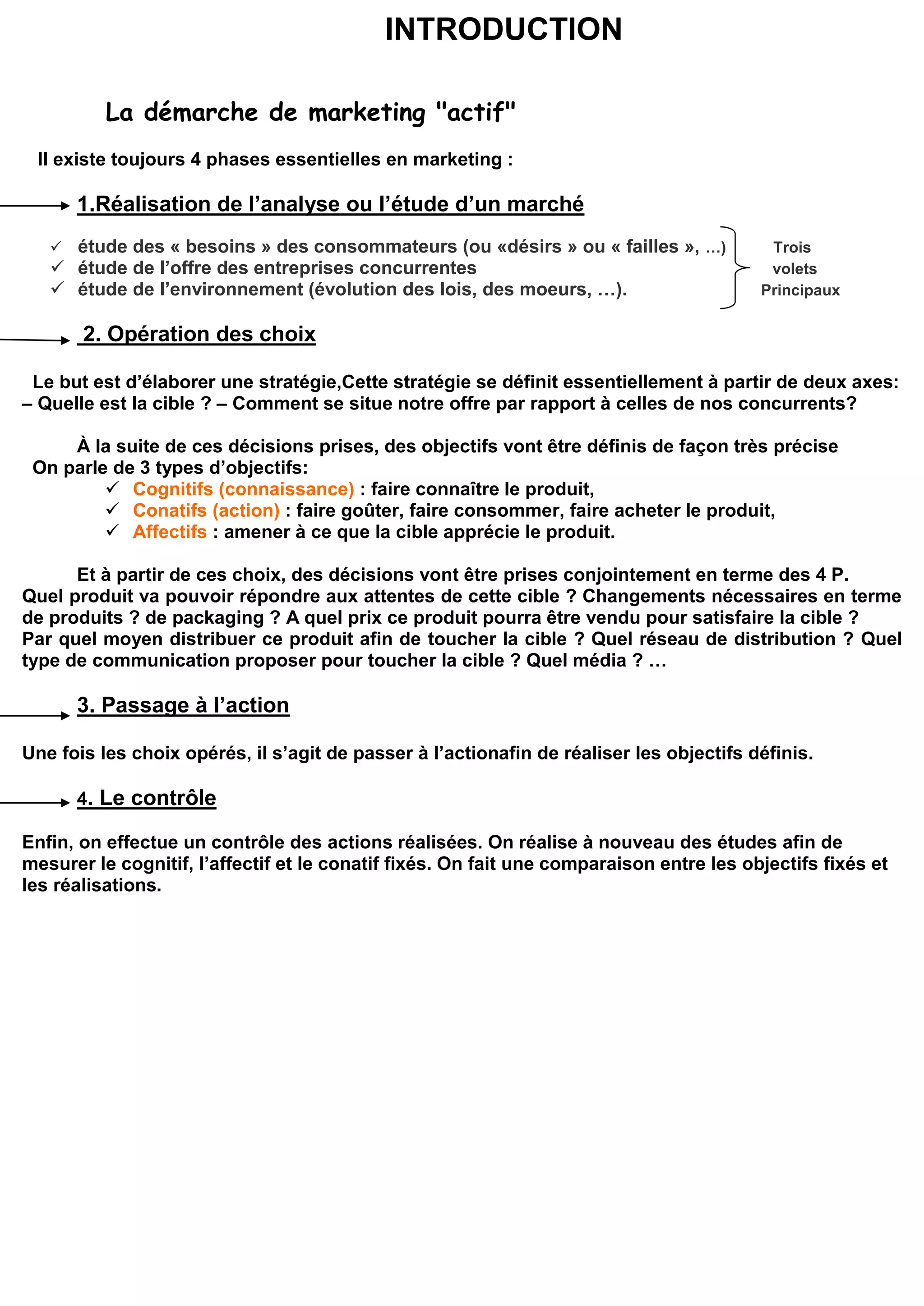 Le document décrit les phases essentielles du marketing, allant de l'analyse du marché à l'élaboration d'une stratégie et à la mise en œuvre d'actions, suivies d'un contrôle des résultats. Il aborde également la classification des produits, les cycles de vie des produits, ainsi que les différentes stratégies d'innovation et d'adaptation nécessaires pour répondre aux besoins du marché. Enfin, il souligne l'importance de la prévision des ventes et des stratégies de réaction face aux écarts entre les objectifs et les performances réelles.