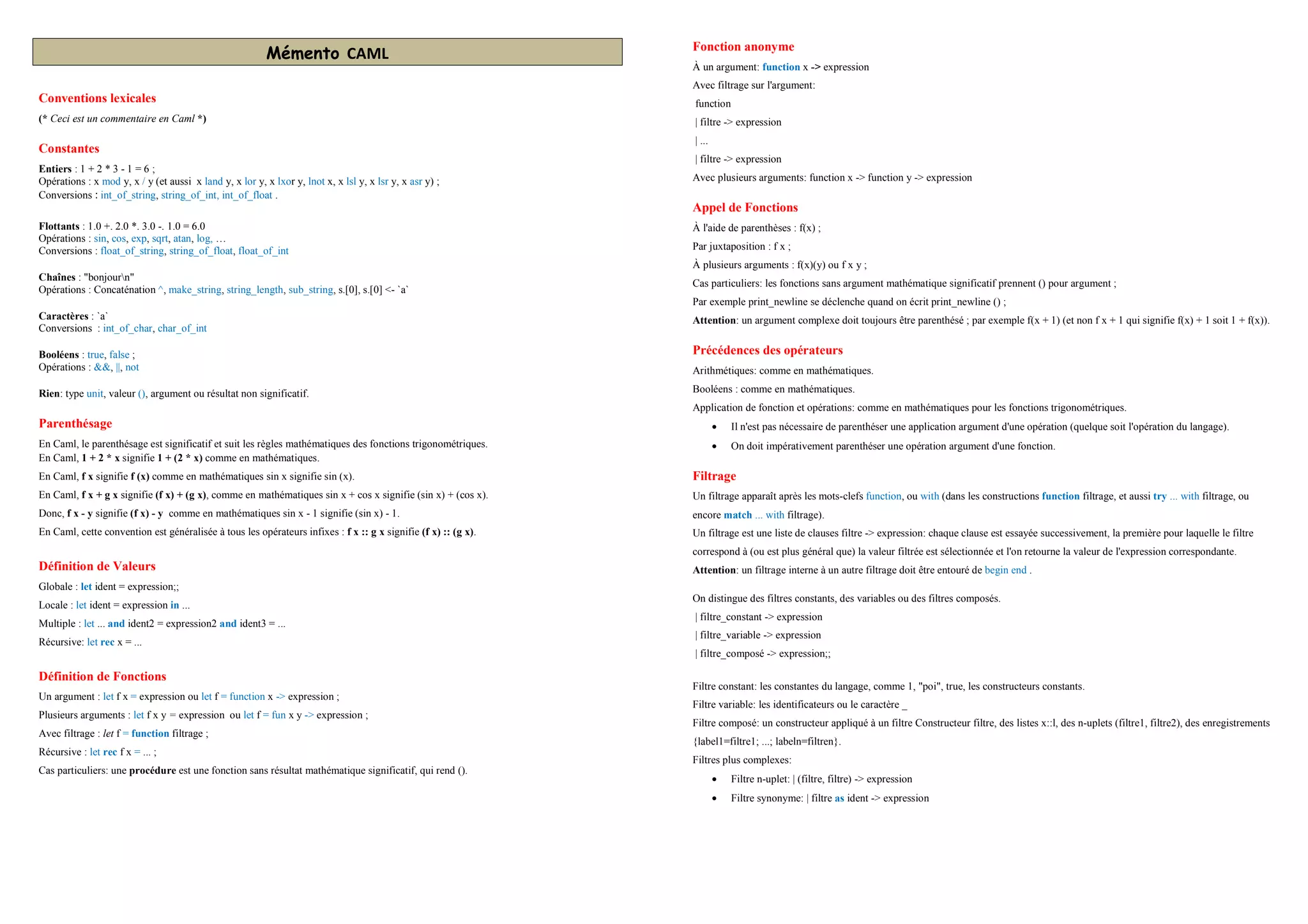 Le document traite des conventions lexicales en OCaml, y compris les types de données (entiers, flottants, chaînes, booléens) et leurs opérations. Il aborde la définition de fonctions, le filtrage patterns, les boucles, les conditions, les exceptions, ainsi que la gestion des entrées-sorties et des types. Des exemples de syntaxe et d'utilisation des différentes fonctionnalités du langage sont également fournis.