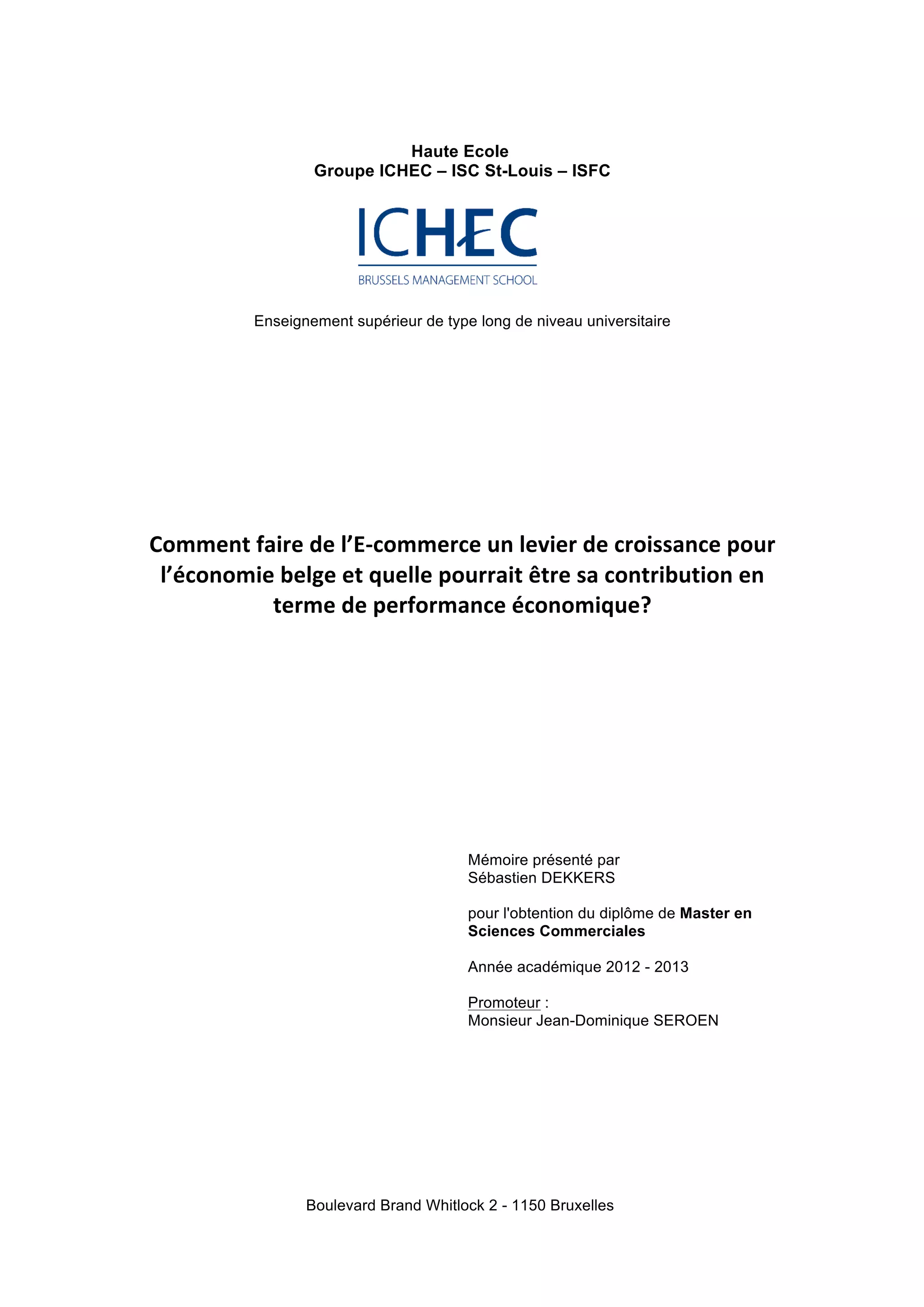 Ce mémoire aborde l'e-commerce comme un levier potentiel pour soutenir la croissance de l'économie belge, en réponse à un contexte macroéconomique défavorable. Malgré une croissance significative du chiffre d'affaires de l'e-commerce, celui-ci représente encore une faible part du commerce de détail total. Les recommandations ciblent l'amélioration de la contribution de l'e-commerce à la performance économique en Belgique.