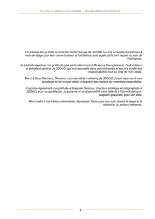 Ce mémoire de stage présente la mise en place d'une stratégie d'e-réputation pour l'entreprise 3dduo, un studio de création de jeux vidéo, durant un stage effectué entre avril et août 2011. Il aborde les enjeux de l'e-réputation, la méthodologie de communication en ligne adaptée aux entreprises, et illustre sa mise en pratique à travers le cas de 3dduo, soulignant l'importance de gérer et entretenir une présence en ligne. Le document explore également les impacts et risques associés à la réputation numérique des entreprises dans le contexte du web 2.0.