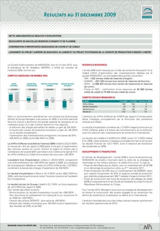 Le groupe Managem a connu une amélioration nette de son résultat d'exploitation en 2009, signalant la découverte de nouvelles réserves de métaux, dont l'argent, le cuivre, et le cobalt, tandis que son chiffre d'affaires a augmenté de 6% malgré un environnement économique difficile. L'année a été marquée par le lancement de projets significatifs, comme le projet aurifère de Bakoudou au Gabon, visant à renforcer sa production de métaux précieux. Pour 2010, Managem prévoit de poursuivre sa stratégie de développement avec des investissements dans l'exploration et l'optimisation de ses capacités de production.