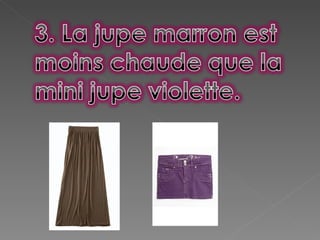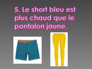 Le document présente des affirmations sur des vêtements, certaines étant vraies et d'autres fausses. Il mentionne des comparaisons de longueur et de chaleur entre différents articles. Chaque affirmation est suivie d'une indication de vérité.