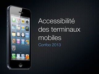 Le document aborde l'accessibilité des terminaux mobiles, soulignant que 70% de la population mondiale possède un mobile et que 80% de leur temps est passé sur des applications. Il discute des améliorations continues et des spécificités d'accessibilité pour différents handicaps, notamment à travers des fonctionnalités présentes dans les systèmes iOS et Android. Enfin, il souligne l'importance de la conformité aux normes d'accessibilité, comme le WCAG 2.0, pour le développement d'applications et de sites web.