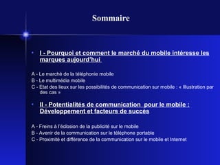Le document explore l'évolution de la communication mobile en France et son inspiration par Internet, soulignant l'importance croissante du mobile pour les marques. Il met en évidence les chiffres du marché, les comportements des utilisateurs et les opportunités pour la publicité sur mobile, tout en mentionnant les obstacles à son développement. Enfin, il discute des différences entre la communication mobile et Internet, notamment en termes de contenu et d'accès.