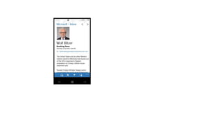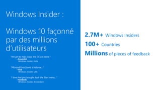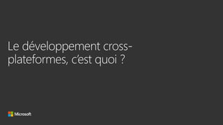 Le document traite des solutions de développement mobile pour Windows, Android et iOS, mettant en avant l'écosystème Microsoft et les outils Visual Studio 2015. Il souligne des fonctionnalités telles que l'authentification avec Windows Hello et les capacités de design adaptatif. Le développement d'applications multiplateformes est facilité par des API unifiées et des outils pour créer des interfaces riches et réactives.