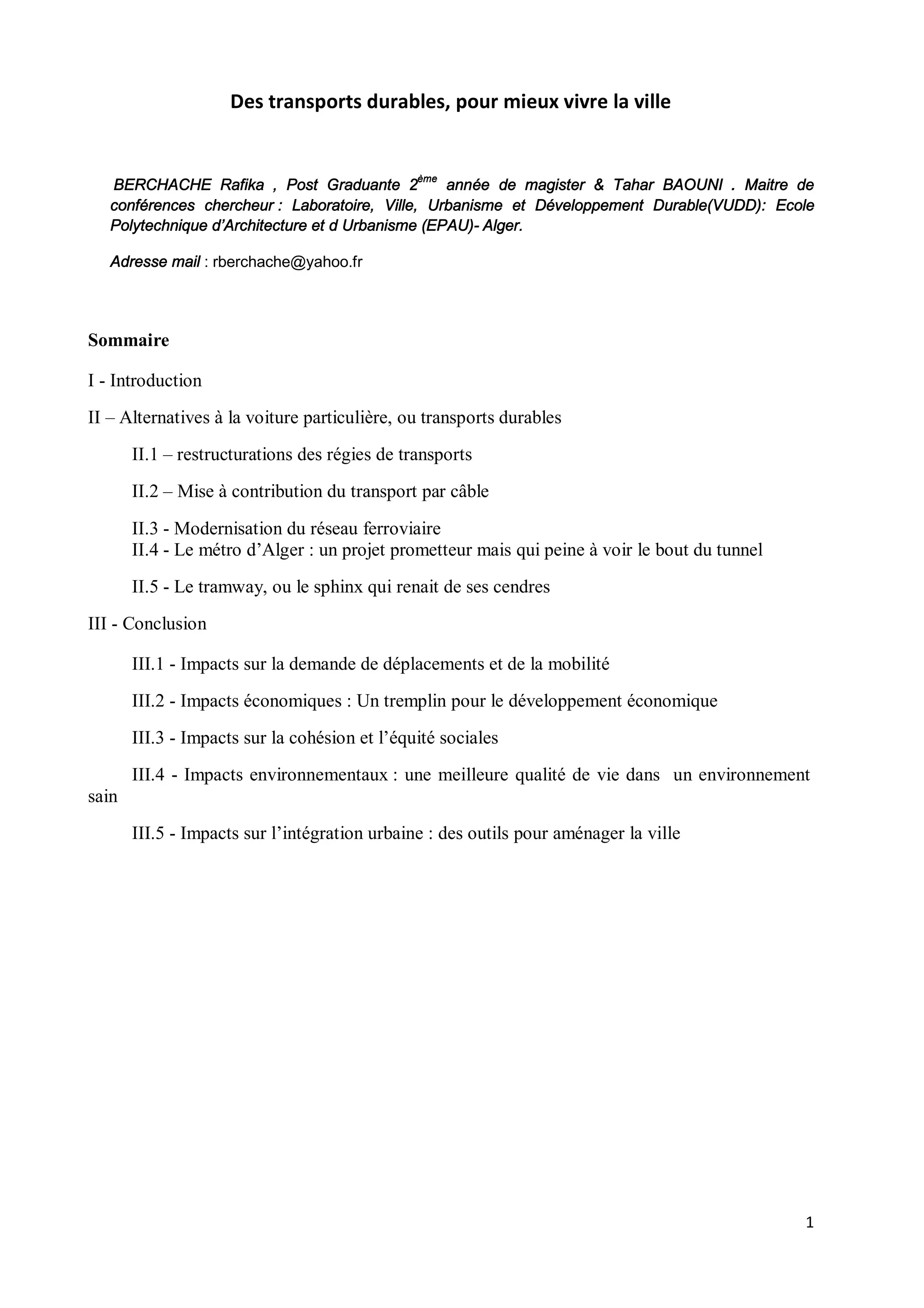 Le document présente un projet sur les transports durables en Algérie, visant à réduire l'utilisation de la voiture particulière et ses effets néfastes, tout en améliorant la mobilité urbaine. Il met en avant diverses alternatives, telles que la modernisation des réseaux ferroviaire et de transports en commun, ainsi que l'intégration de nouveaux modes comme le métro et le tramway. L'objectif est d'assurer un développement urbain durable, moins polluant et plus accessible pour tous les citoyens.