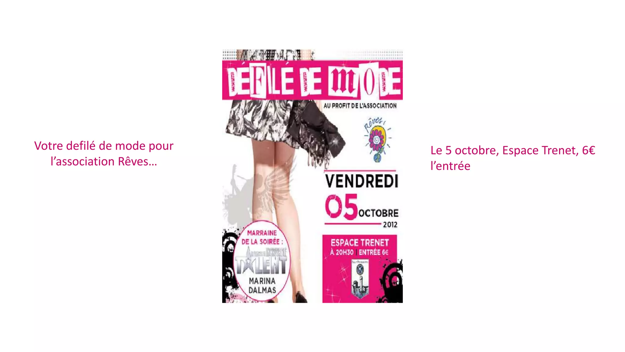Un défilé de mode pour l'association Rêves aura lieu le 5 octobre à l'espace Trenet, avec un prix d'entrée de 6€. La soirée sera organisée par Jean-Claude Biguine et marraine par Marina Dalmas de 'La France a un incroyable talent'. L'événement vise à collecter des fonds pour permettre aux enfants malades de réaliser leurs rêves.