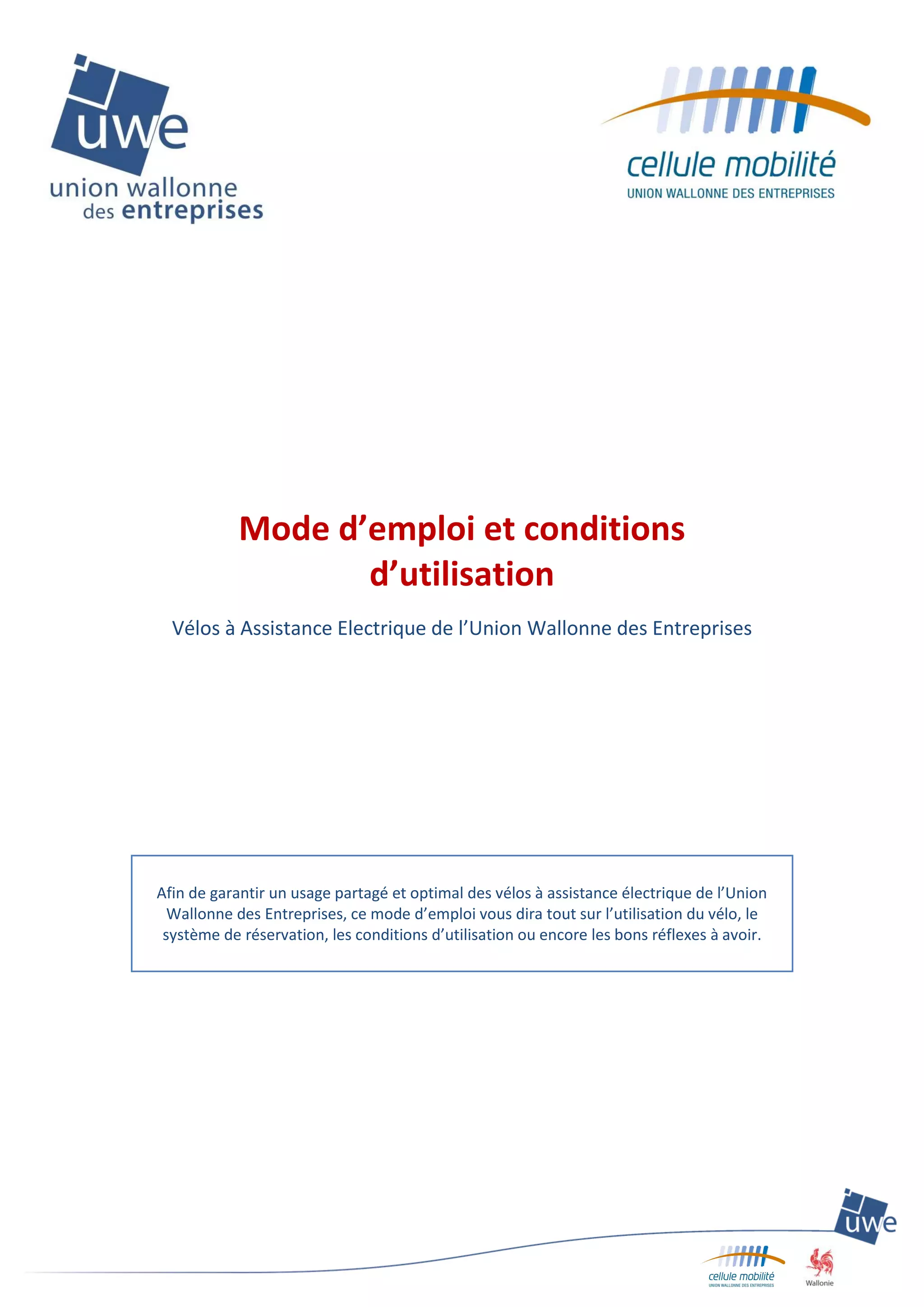 Le document est un mode d'emploi détaillant les conditions d'utilisation des vélos à assistance électrique (VAE) mis à disposition par l'Union Wallonne des Entreprises (UWE) pour différents publics et usages. Il couvre l'inscription, la réservation, les procédures d'accès, ainsi que les bonnes pratiques d'utilisation et de sécurité des VAE. Enfin, il mentionne les responsabilités des utilisateurs et les conséquences en cas de non-respect des règles établies.