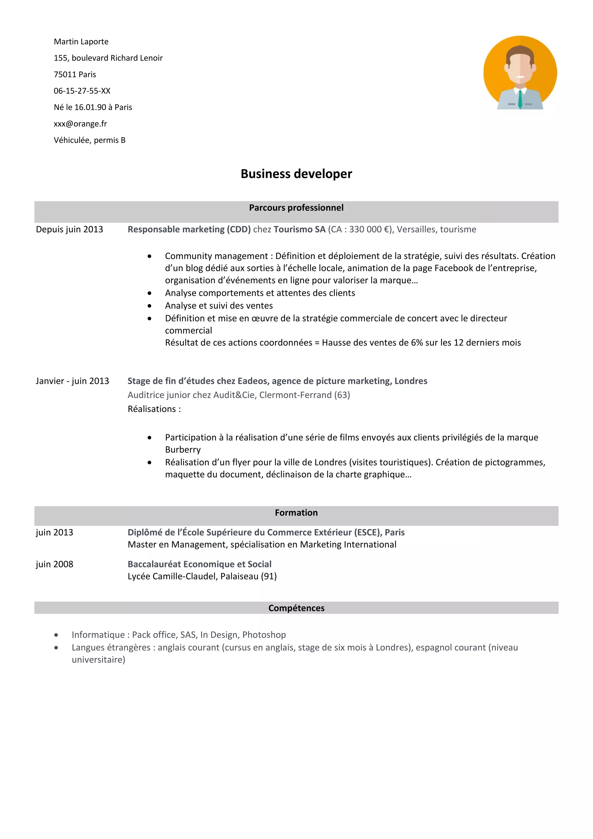 Martin Laporte, diplômé en management avec une spécialisation en marketing international, occupe un poste de responsable marketing chez Tourismo SA depuis juin 2013, où il a réussi à augmenter les ventes de 6% en un an. Il possède une expérience en community management et en analyse du comportement des clients, ainsi qu'une formation en audit et picture marketing. Ses compétences incluent une maîtrise des outils informatiques et des langues étrangères telles que l'anglais et l'espagnol.