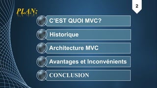 Le document présente l'architecture MVC, un modèle de conception qui sépare l'affichage, la logique des affaires et l'accès aux données, en détaillant son historique, ses composants (Model, View, Controller), ainsi que ses avantages et inconvénients. Conçu par Trygve Reenskaug en 1979, le modèle a évolué et est utilisé dans divers langages de programmation. Bien qu'il soit adapté aux grands projets, son utilisation peut être complexe pour les petites applications.